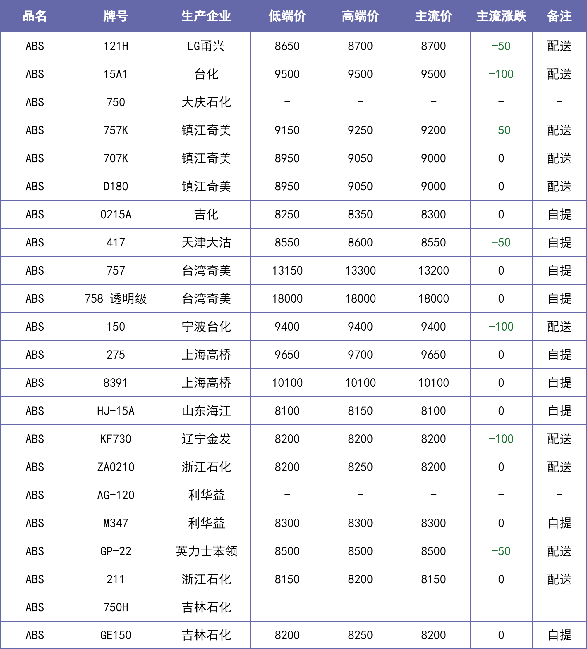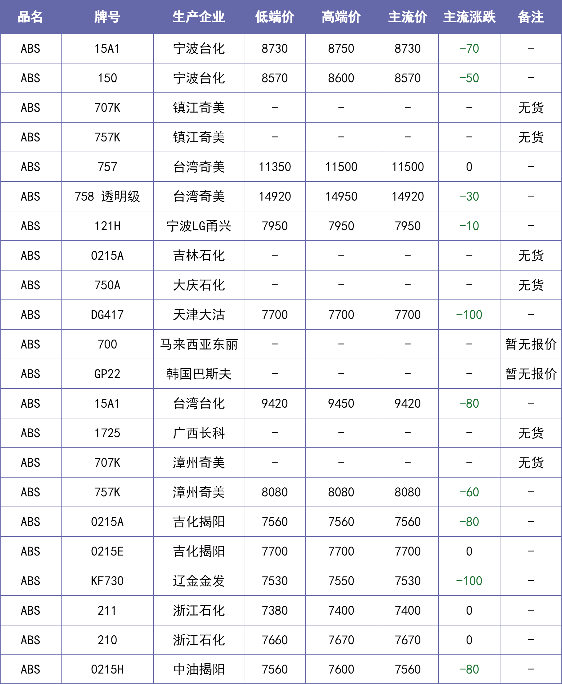 12月2日,国内ABS市场价下跌,主流市场价格波动10-100元/吨。