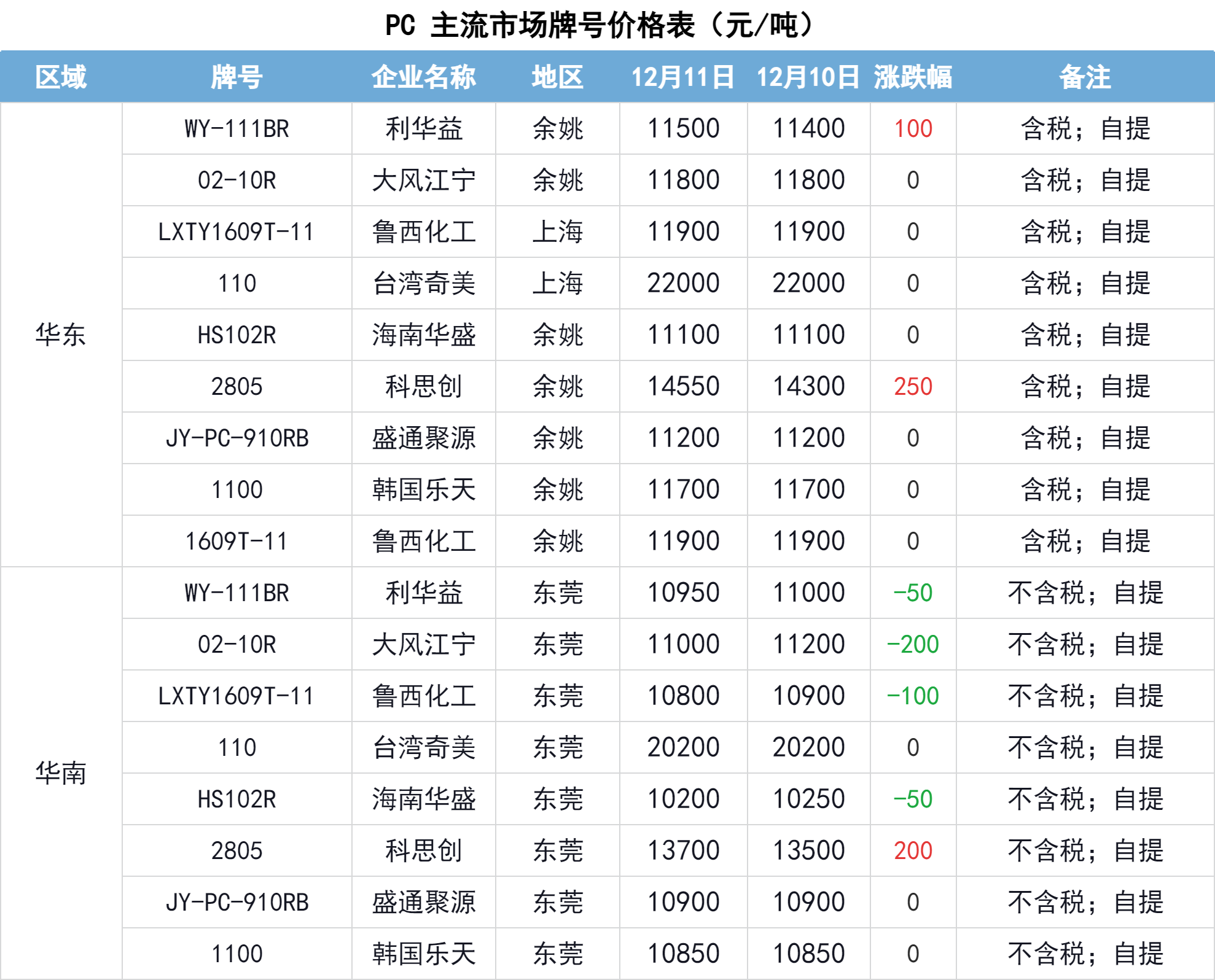 12月11日,国内PC市场互有涨跌,主流市场价波动50-250元/吨。市场供应利好尚存,支撑持货商报盘坚挺,随行走货为主,需求端表现谨慎,下游企业多消化原料库存,对原料涨势存观望心态,交投略显僵持。