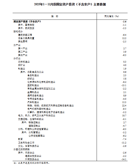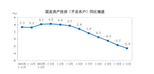 2025年1—11月份,全国固定资产投资(不含农户)444035亿元,同比下降2.6%(按可比口径计算,详见附注7)。其中,民间固定资产投资同比下降5.3%。从环比看,11月份固定资产投资(不含农户)下降1.03%。
