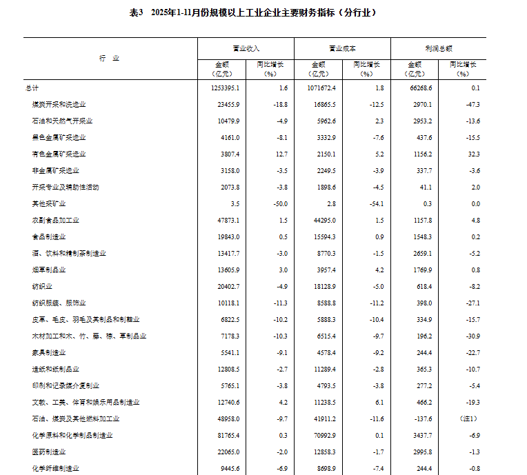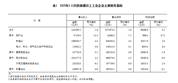 1—11月份,全国规模以上工业企业实现利润总额66268.6亿元,同比增长0.1%(按可比口径计算,详见附注二)。