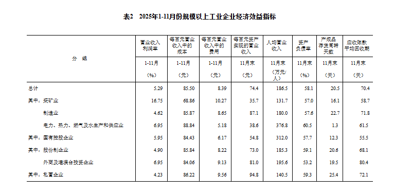 11月末,规模以上工业企业每百元资产实现的营业收入为74.4元,同比减少2.4元;人均营业收入为186.5万元,同比增加5.7万元;产成品存货周转天数为20.5天,同比增加0.6天;应收账款平均回收期为70.4天,同比增加3.7天。