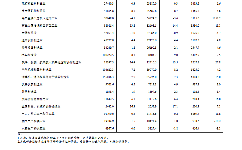 1—11月份,主要行业利润情况如下:计算机、通信和其他电子设备制造业利润同比增长15.0%,电力、热力生产和供应业增长11.8%,有色金属冶炼和压延加工业增长11.1%,汽车制造业增长7.5%,农副食品加工业增长4.8%,通用设备制造业增长4.8%,专用设备制造业增长4.6%,电气机械和器材制造业增长4.2%,石油、煤炭及其他燃料加工业同比减亏,非金属矿物制品业下降4.6%,化学原料和化学制品制造业下降6.9%,纺织业下降8.2%,石油和天然气开采业下降13.6%,煤炭开采和洗选业下降47.3%。