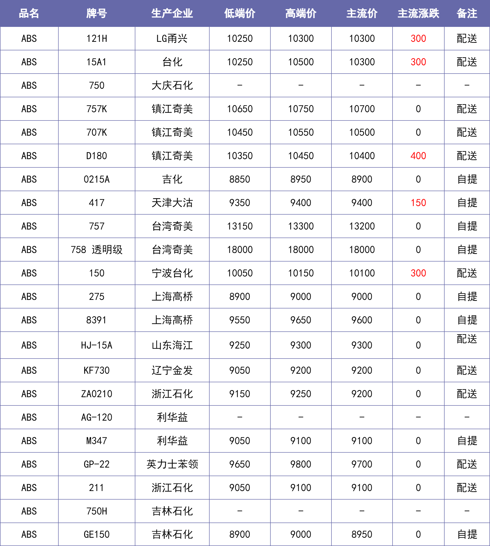 1月27日上午,国内ABS市场价上涨,主流市场价格波动20-400元/吨。