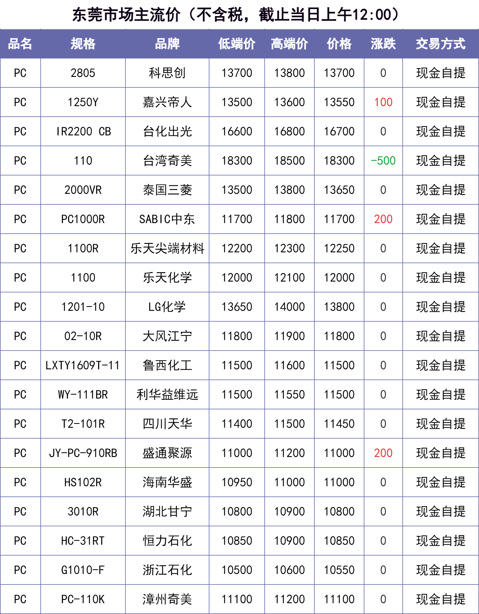 说明:除特别备注说明外,东莞、汕头等华南地区市场价默认不含税,其他地区含税。【每日新价】来源当地本土市场主流价汇总,每日12:00之前更新。不排除下午市场价格发生变化的可能。仅供参考~