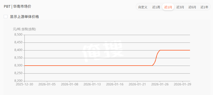 本周国内PBT市场价格个别上涨,主流市场价格波动100元/吨。本期PBT装置检修计划增加,供应量小幅回落。原料PTA仍延续强势运行,高位成本下PBT市场跟涨操作增加,供应端挺市心态占据主流。需求面进入节前备货阶段,但市场整体交投氛围一般,下游及终端对高价较抵触,议价情绪较强,供需心态博弈。