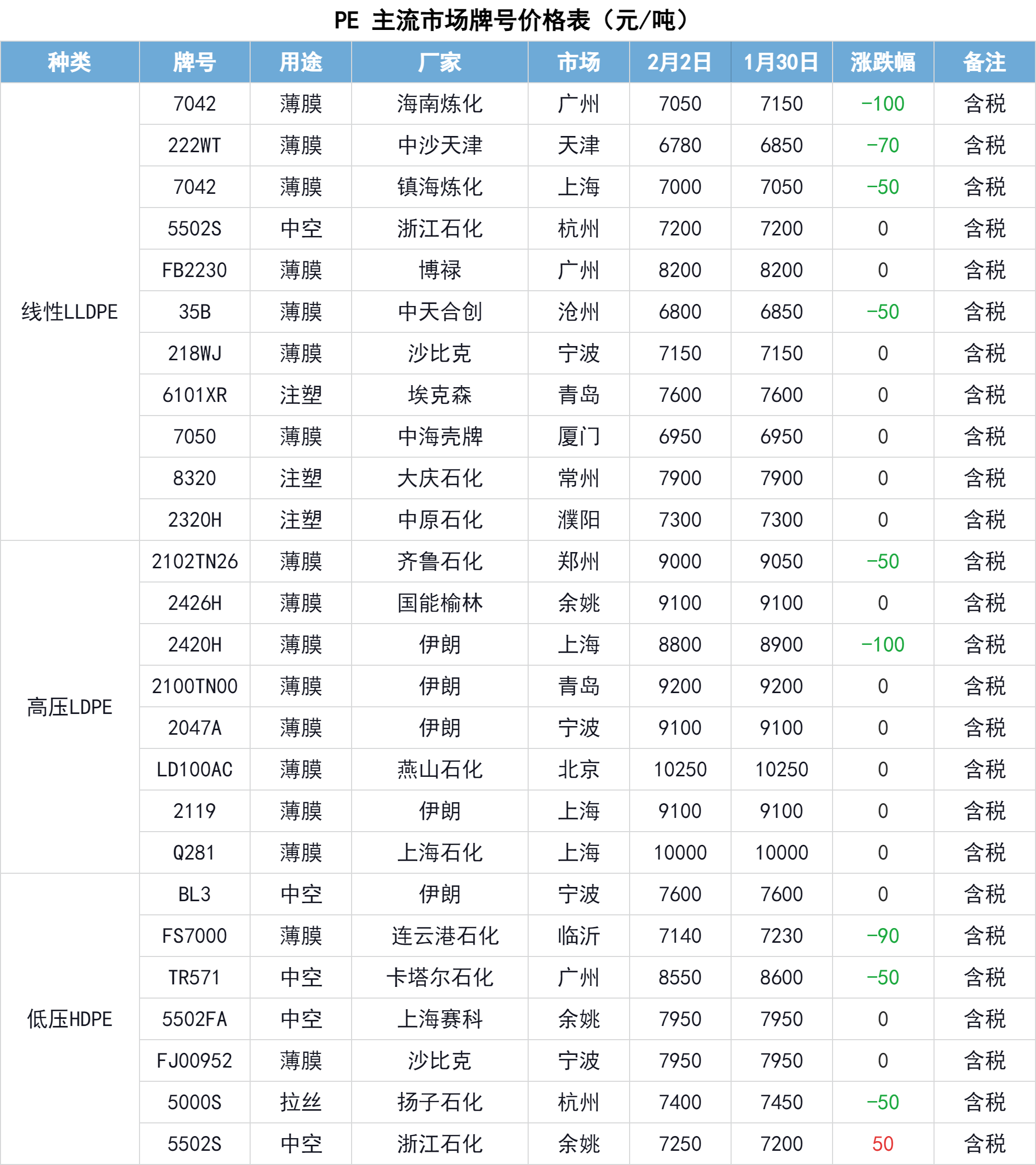 2月2日,国内PE市场价格下跌,部分市场牌号调整50-100元/吨。宏观支撑减弱,业者观望情绪加重。虽然今日成交氛围略有好转,但主要以低端货源为主。