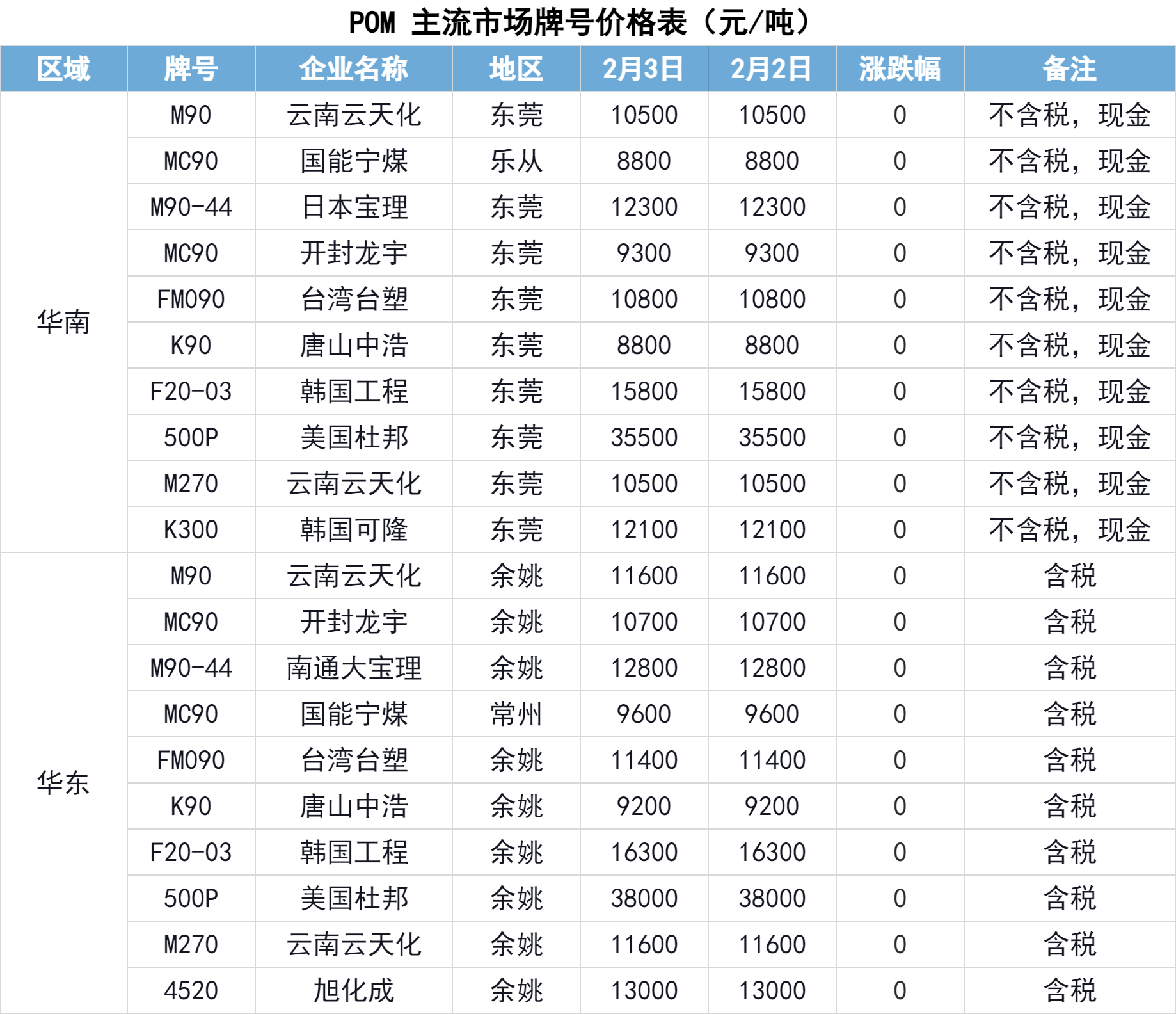 2月3日,国内POM主流市场稳定。市场盘整为主。春节假期将近,基本面暂无指引消息,市场订单跟进步伐相对缓慢,石化厂出货存压,部分贸易商延续让利操作,仍有部分挺价出货为主,节前终端用户补货情绪相对谨慎,成交整体欠佳。
