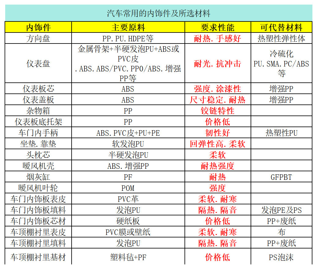1、耐热性:因夏季长时间光照,车厢内温度比较高,要求内饰件材料具有高耐热性;