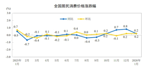 2026年1月份,全国居民消费价格同比上涨0.2%。其中,城市上涨0.2%,农村上涨0.1%;食品价格下降0.7%,非食品价格上涨0.4%;消费品价格上涨0.3%,服务价格上涨0.1%。