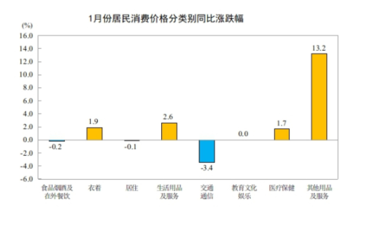 1月份,食品烟酒及在外餐饮类价格同比下降0.2%,影响CPI(居民消费价格指数)下降约0.06个百分点。食品中,蛋类价格下降9.2%,影响CPI下降约0.05个百分点;畜肉类价格下降6.1%,影响CPI下降约0.26个百分点,其中猪肉价格下降13.7%,影响CPI下降约0.28个百分点;鲜菜价格上涨6.9%,影响CPI上涨约0.12个百分点;鲜果价格上涨3.2%,影响CPI上涨约0.06个百分点;水产品价格上涨0.7%,影响CPI上涨约0.01个百分点。
