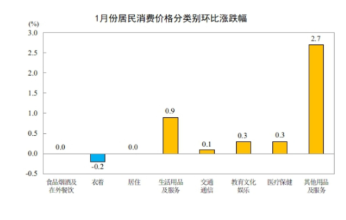1月份,食品烟酒及在外餐饮类价格环比持平。食品中,蛋类价格上涨2.7%,影响CPI上涨约0.01个百分点;鲜果价格上涨2.0%,影响CPI上涨约0.04个百分点;水产品价格上涨2.0%,影响CPI上涨约0.04个百分点;畜肉类价格上涨0.5%,影响CPI上涨约0.02个百分点,其中猪肉价格上涨1.2%,影响CPI上涨约0.02个百分点;鲜菜价格下降4.8%,影响CPI下降约0.10个百分点。