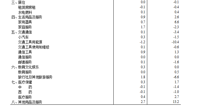 其他七大类价格同比四涨一平两降。其中,其他用品及服务、生活用品及服务价格分别上涨13.2%和2.6%,衣着、医疗保健价格分别上涨1.9%和1.7%;教育文化娱乐价格持平;交通通信、居住价格分别下降3.4%和0.1%。