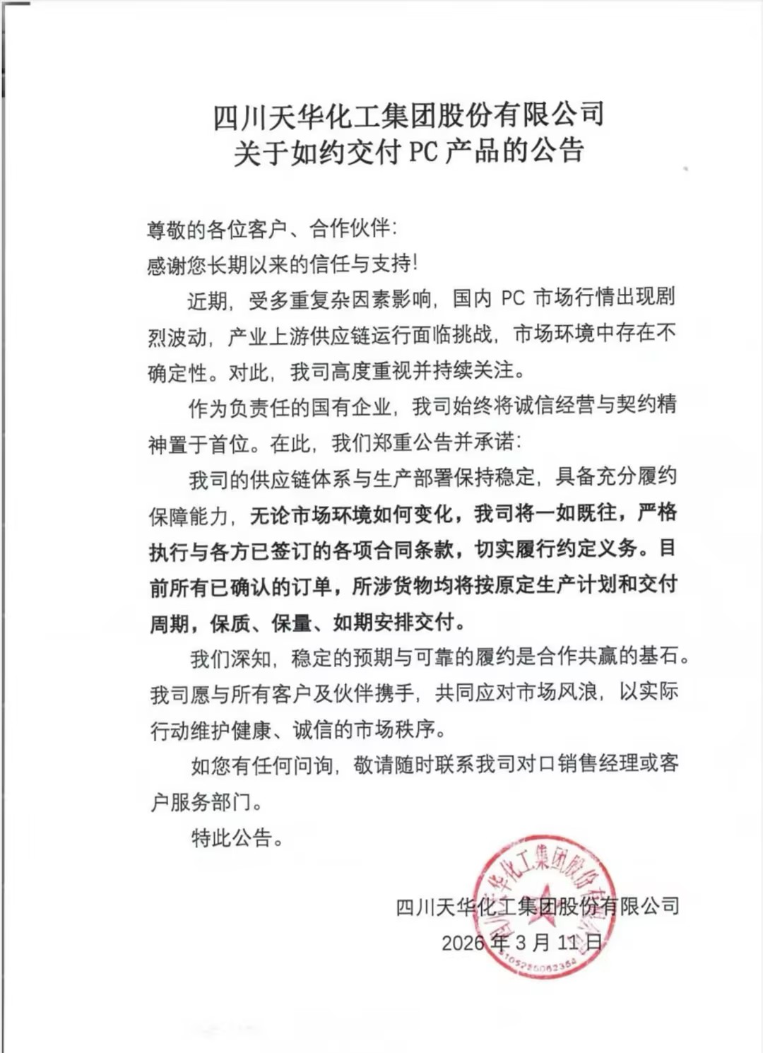 四川天华化工集团股份有限公司发布公告称,近期国内PC市场行情剧烈波动,上游供应链面临挑战。作为负责任的国有企业,公司承诺供应链体系与生产部署保持稳定,具备充分履约保障能力,所有已确认订单将按原定计划保质、保量、如期交付。PC(聚碳酸酯)是重要工程塑料,广泛应用于电子电器、汽车等领域。