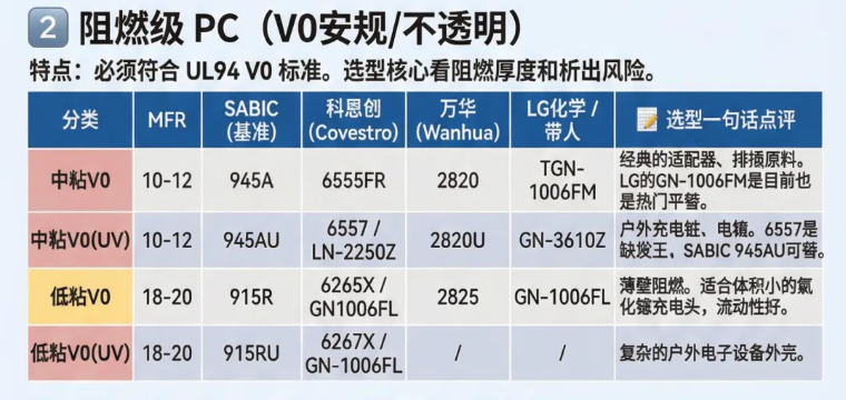 阻燃替代:如果是做充电头外壳,原本用 SABIC 925 或 科思创 6265,可以尝试万华 FR2820T,这两款在模具积垢(模垢)控制上表现不错。