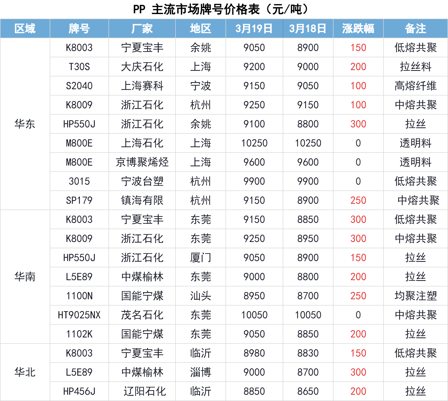 3月19日,国内PP市场上涨,主流市场价格波动100-300元/吨。主流市场行情价格窄幅上涨。地缘政治影响仍存在不确定性,原油价格持续上涨,成本端支撑增强。期货盘面强势上涨,现货市场跟涨,贸易商随行就市上调报盘价格,然下游厂家对高价货源存抵触心理,市场实盘成交为主。