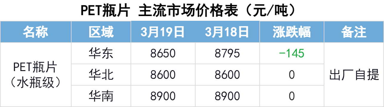 3月19日,PET市场下跌,主流市场价格波动145元/吨。聚酯原料震荡调整,成本端支撑一般,多数瓶片企业报价稳定,个别下调,市场实际商谈重心僵持整理。下游按需跟进,谨慎观望情绪仍存。