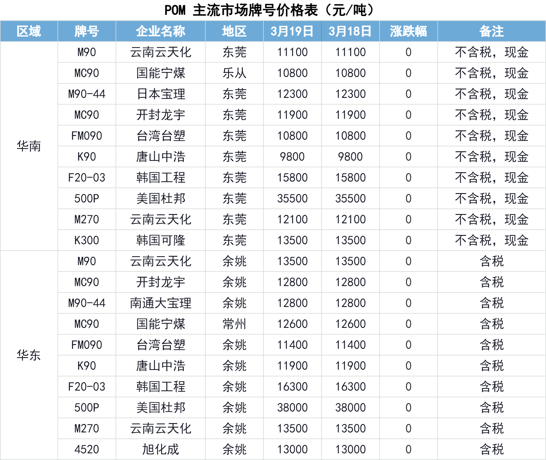 3月19日,国内POM主流市场稳定。市场行情偏弱整理,近期主流厂家出厂仍有补涨操作,然场内贸易商前期溢价幅度较高,随着下游用户对高价抵触心理增加,成交存一定阻力,部分业者报盘略有会回调,实单成交价格重心表现下移。进口料方面近期在原料推涨行情下价格开始上调,业者挺价心态偏强,实单成交或受成交冷清影响有让利商谈空间。