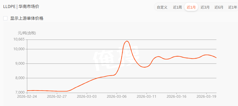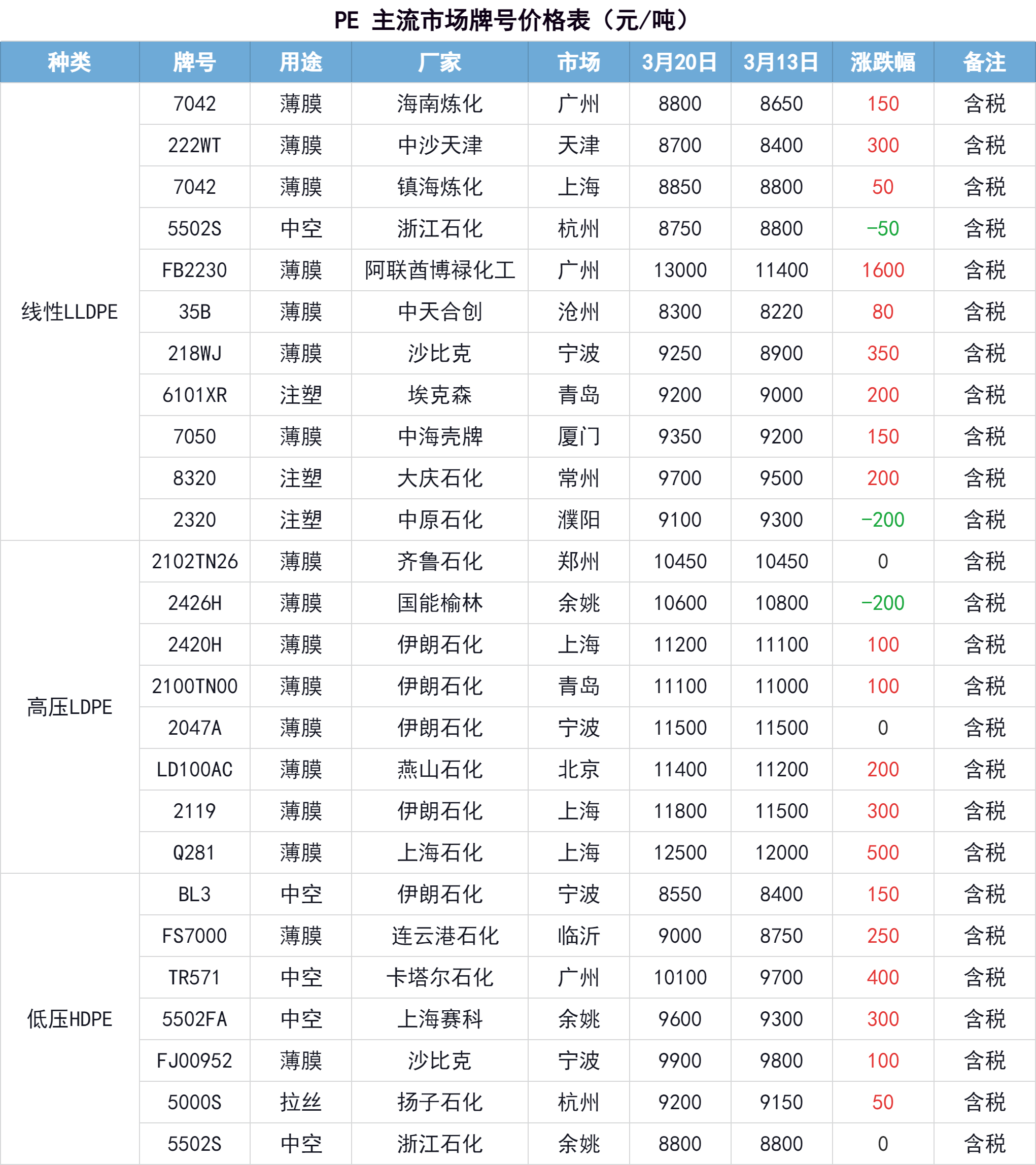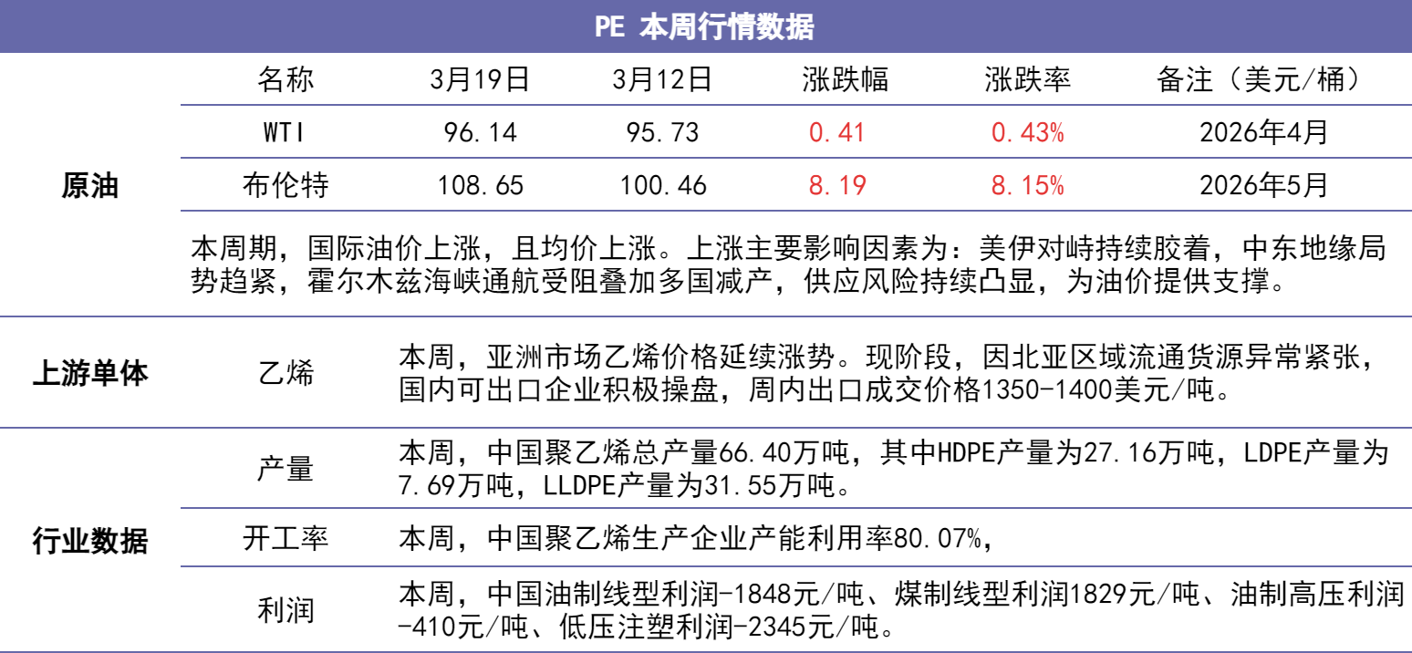 本周国内PE市场跌-涨-跌,主流市场牌号价波动50-1600元/吨。本周国内聚乙烯现货市场价格多数上涨,LDPE价格回落。本周受中东地缘冲突持续影响,生产企业预防性降负荷或停车的表现增加,供应缩量预期持续兑现。叠加成本端的支撑,聚乙烯价格本期多数呈现上涨趋势。但LDPE产品前期炒作行为较重,致使采购积极性减弱,本期价格出现回落。