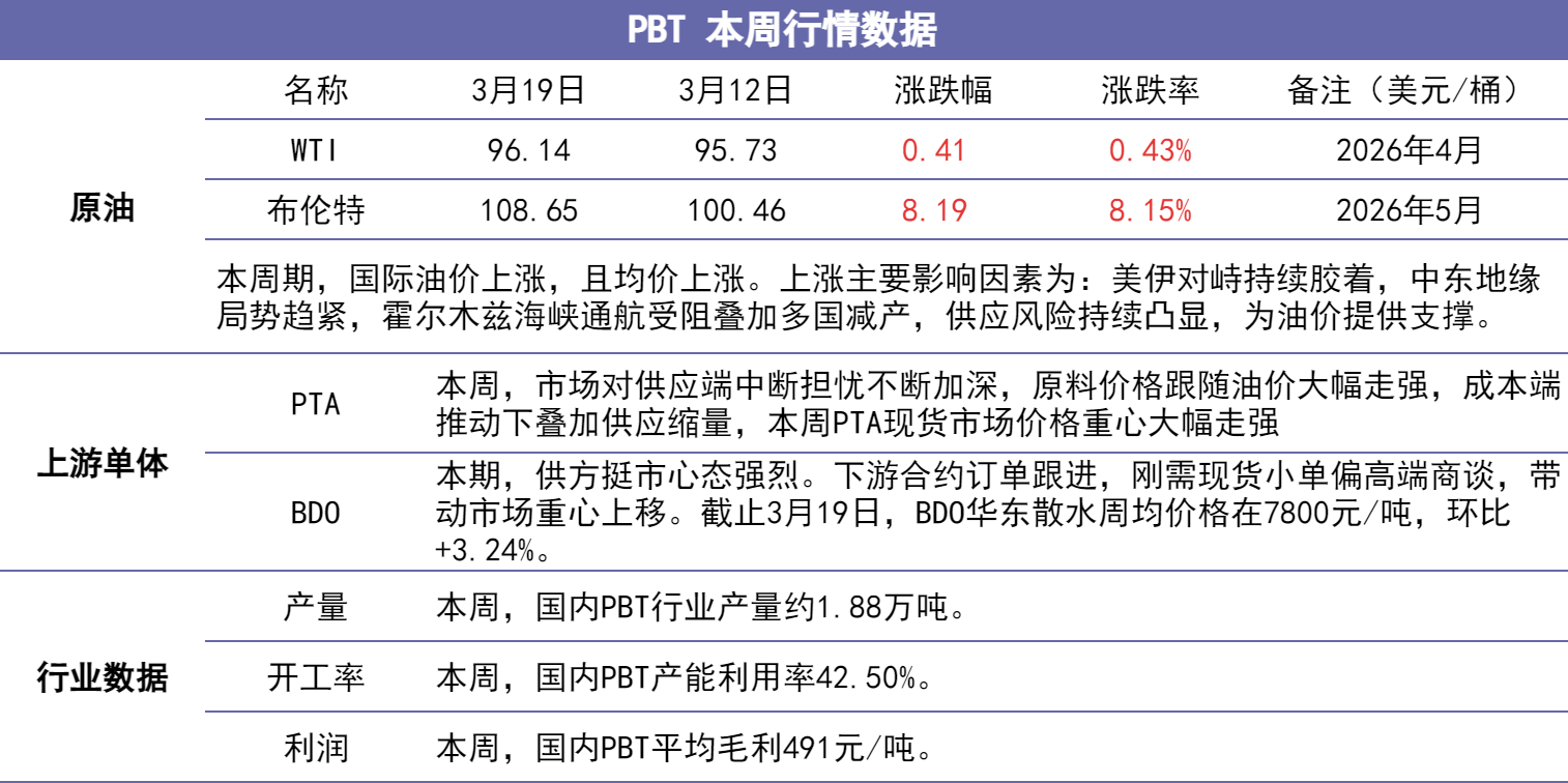 本周国内PBT市场价格下跌,主流市场价格波动60-200元/吨。中东冲突导致多处石油设施遭袭,加剧市场对供应风险担忧,原材料高位风险危机尚未解除,PBT挺价心态占主导。供应面,受成本增加的影响,PBT装置开工不足,产能利用率低位。PBT下游需求处于复苏阶段,但是价格高位,下游采购成本增加,补库以及接单热情减弱,市场心态观望为主,刚需高位零星成交。