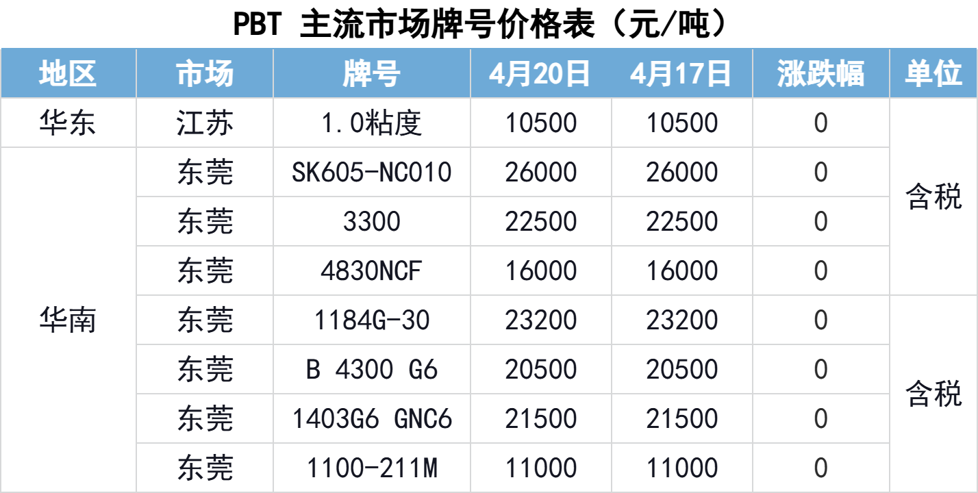 4月20日,PBT市场主流价持稳,主流市场价格较昨日稳定。需求端拖累,市场买气不足,现货基差偏弱整理,今日华东PTA价格下跌。BDO交易周期交替期,业者观望情绪为主,部分供方5月政策平稳。今日PBT高位下调,走货积极,主动降价,刺激五一节前下游备货情绪。