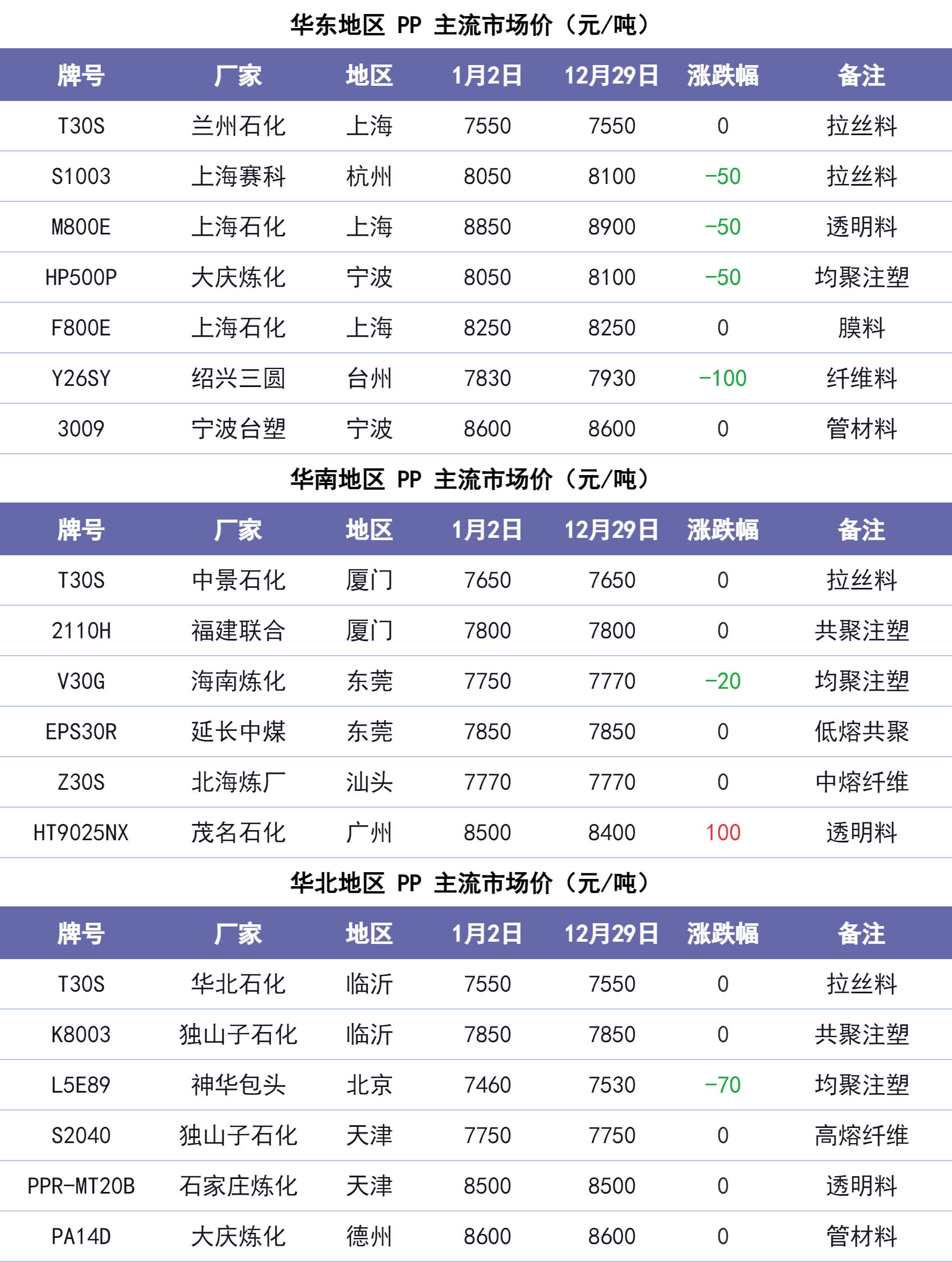 1月2日,国内PP市场多走跌,部分牌号市场价跌20-100元/吨。节后归来,盘面震荡走跌,现货报盘跟随下行,两油库存高位累积,供应面承压明显。下游订单疲软制约原料流通力度,场内交投平淡。