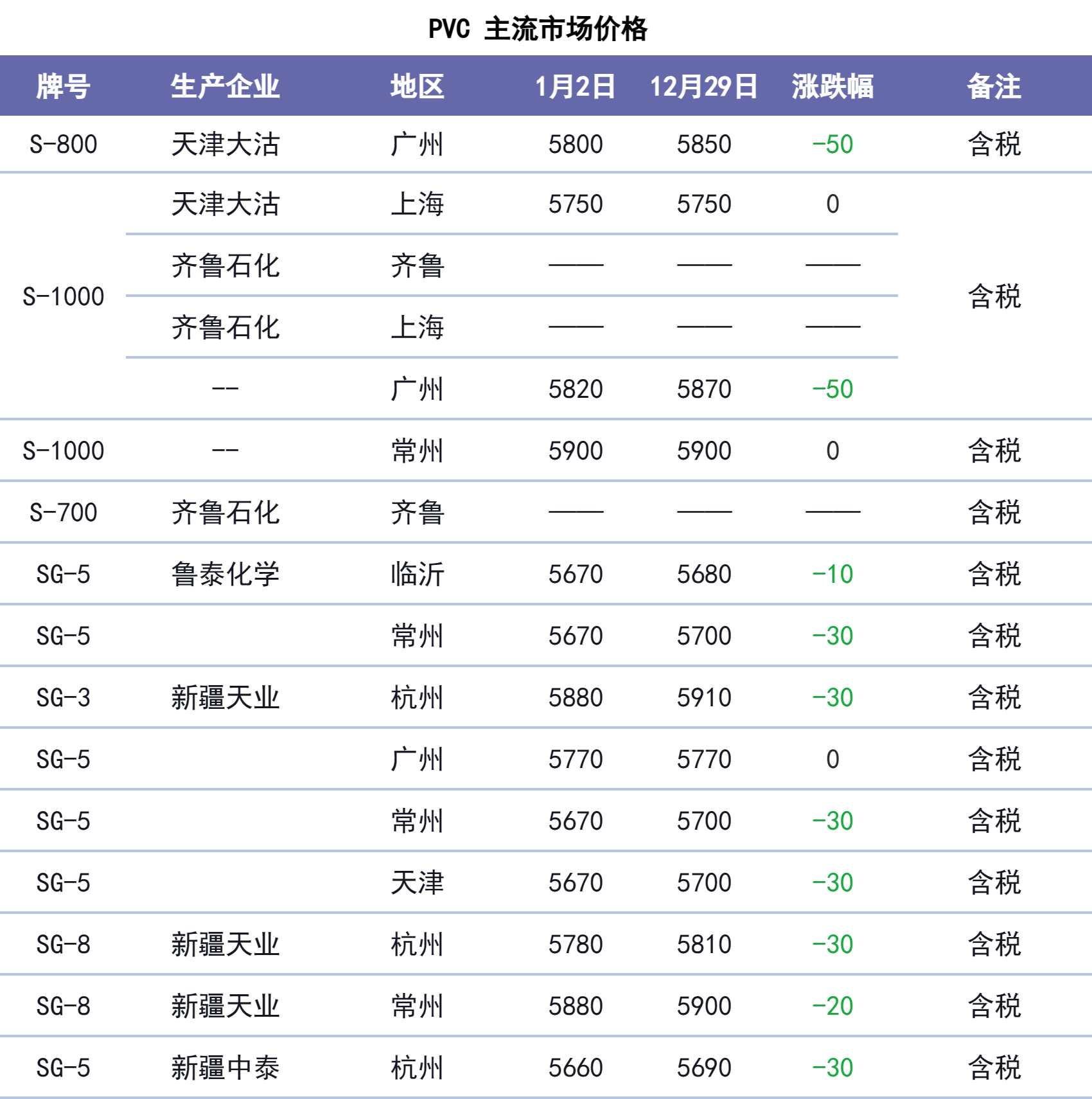 1月2日,国内PVC市场小幅下跌,主流牌号市场价跌10-50元/吨。PVC基本面维持弱势,上游生产企业检修计划偏少,生产减损量环比下降,市场供应压力增加,下游维持刚需低价采购,远期节日停工放假预期偏弱,现货市场价格重心维持弱势震荡,期货盘面受相关大宗商品提振,但成交高位受限,华东地区电石法五型现汇库提价格在5600-5680区间,乙烯法僵持在5800-6000区间到货。